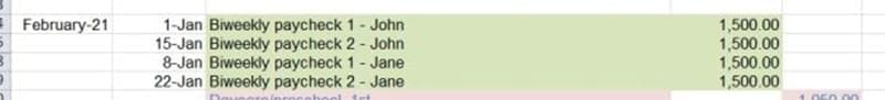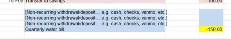 List your regular bills with due dates and expected amounts. If you follow my example, you’ll use blue text for autodebit items, to differentiate from items you need to manually pay each month (black text). Copy that block of transactions a few times to build out the next few months.